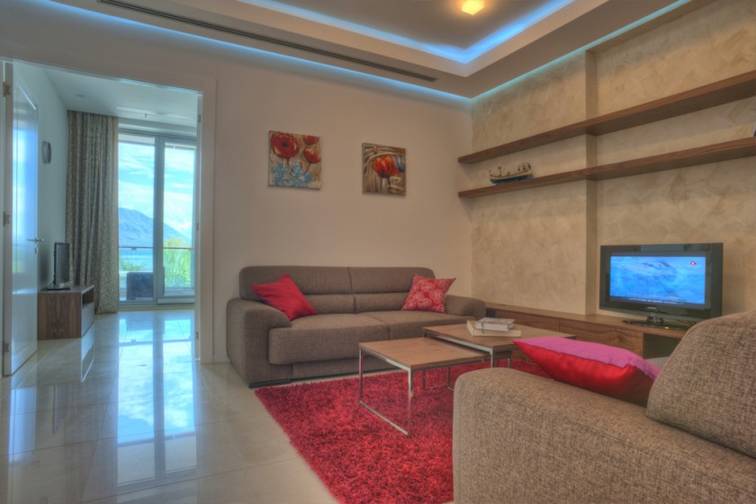 Potpuno namješten dvosoban stan sa pogledom na more i dizajnerskim enterijerom u strogom centru Budve, na samo nekoliko koraka od rive, Starog grada Budve i marine za jahte.