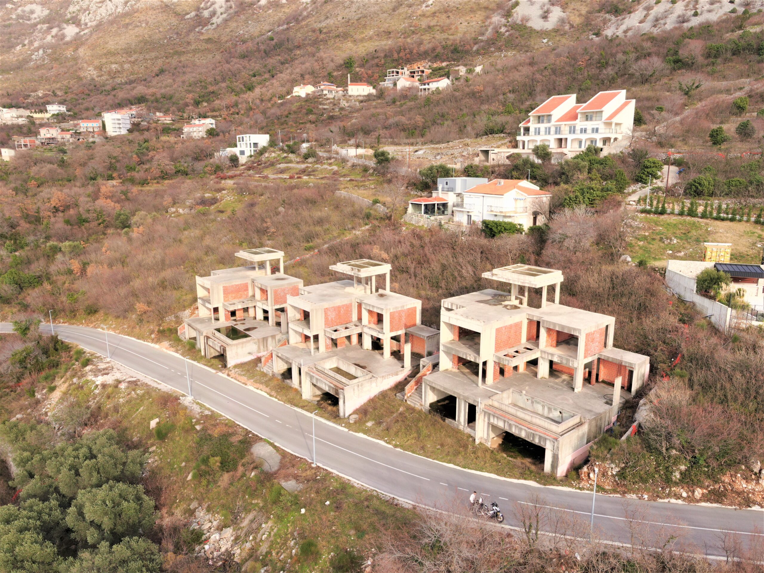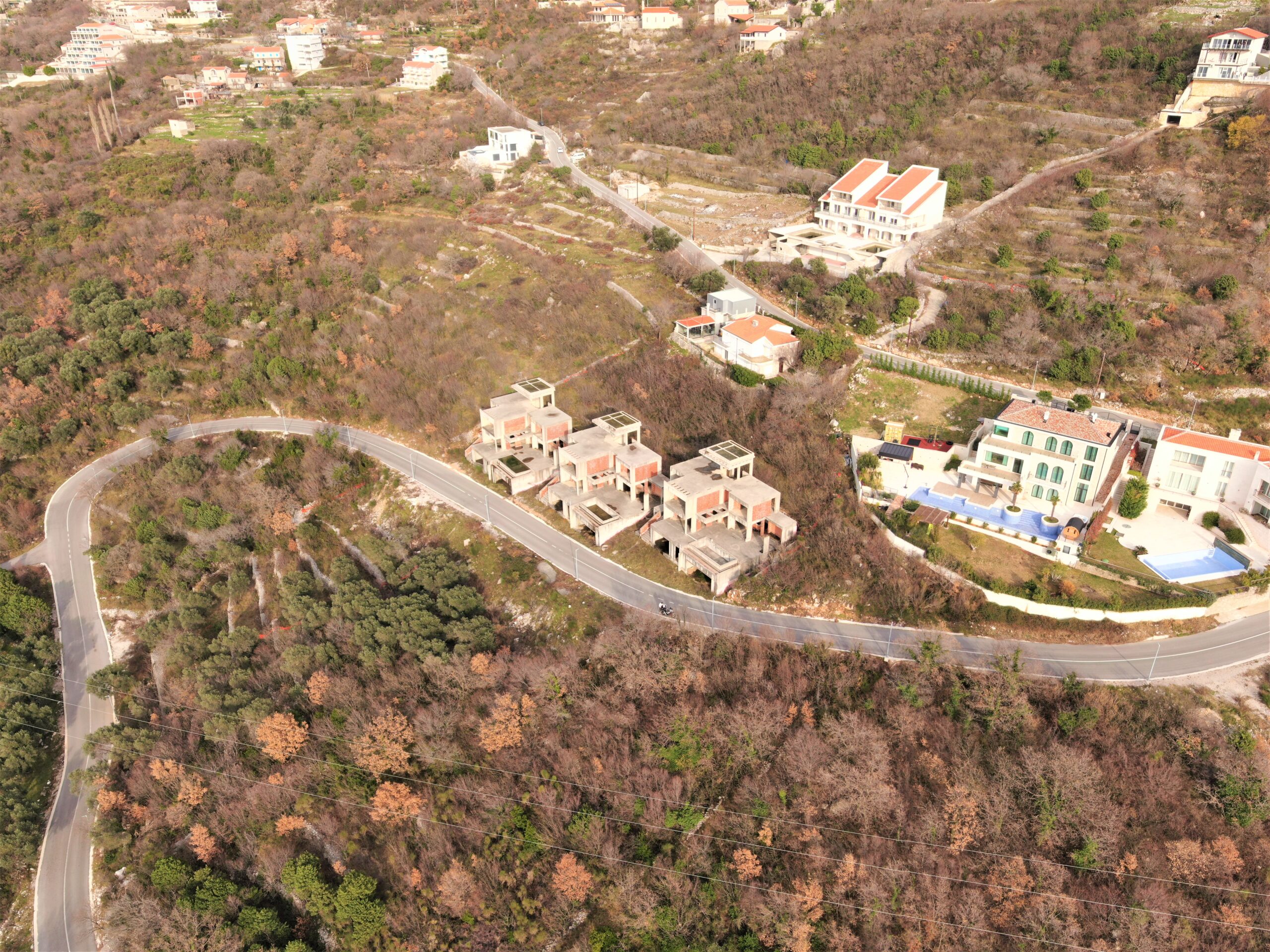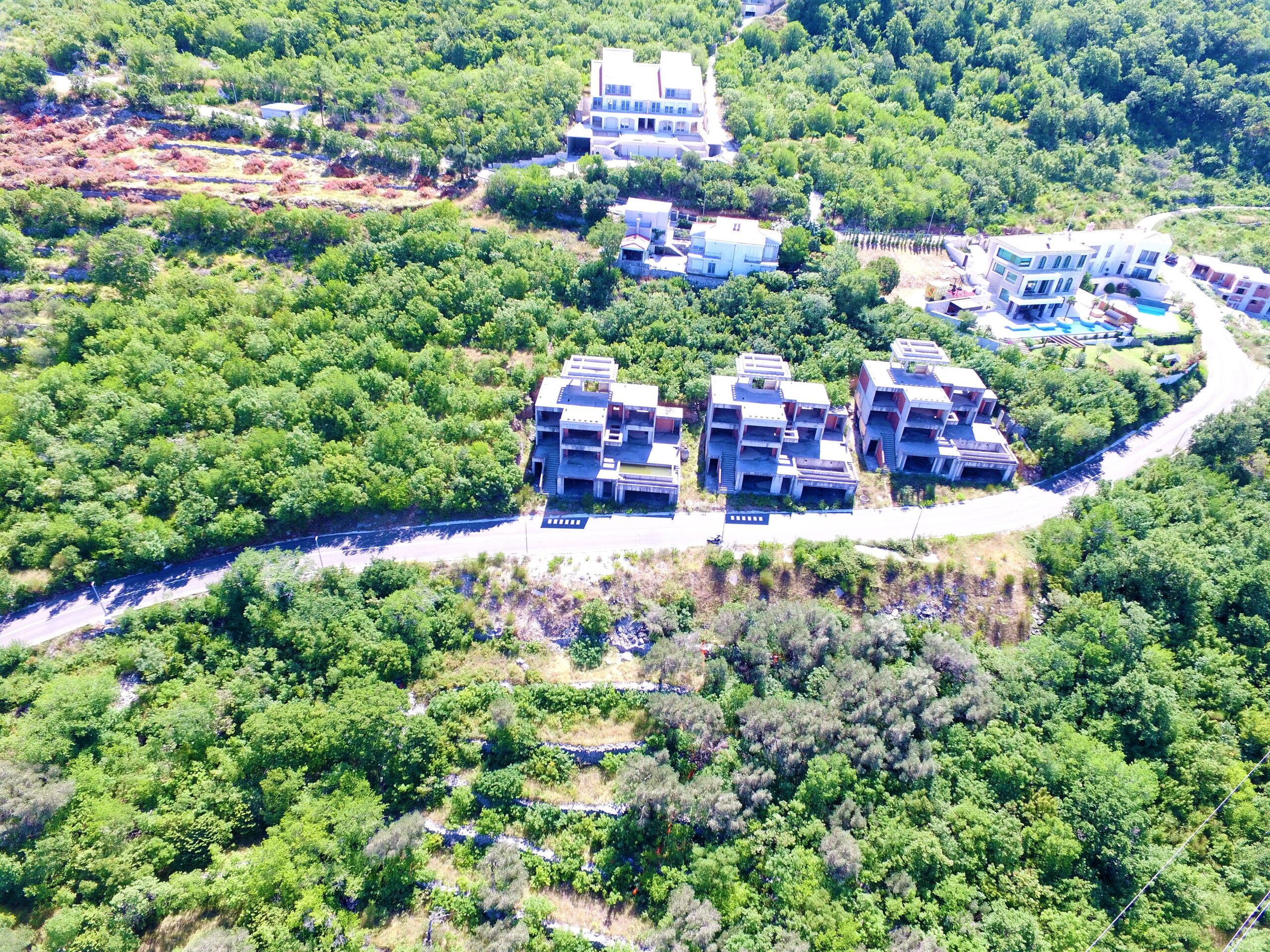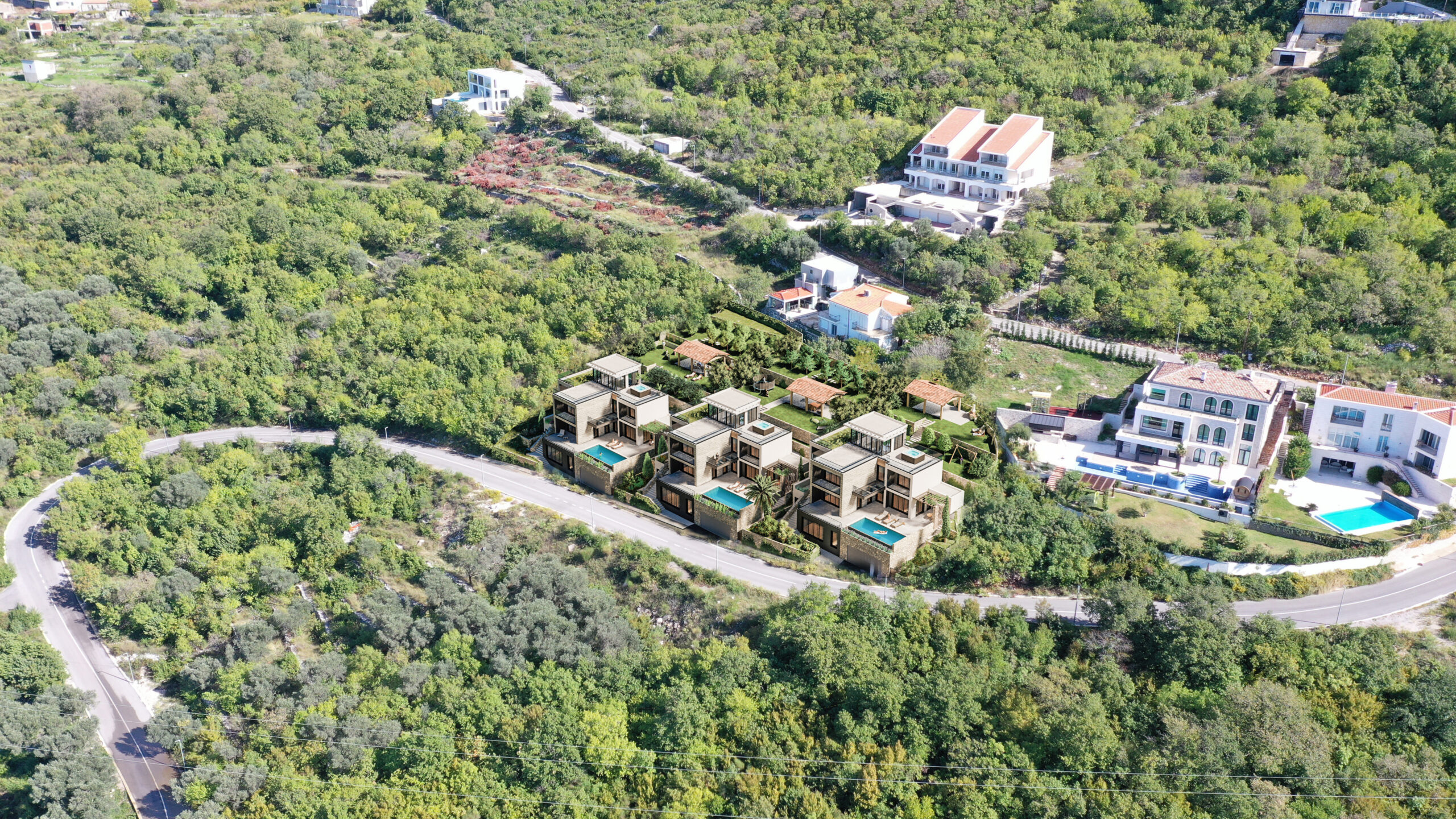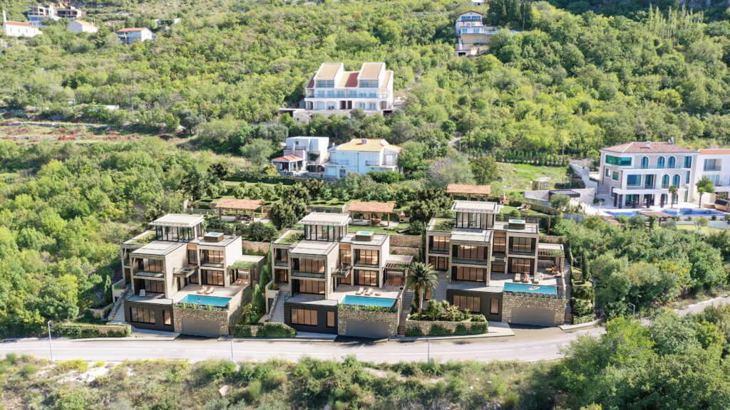 U sve popularnijem naselju Tudorovići, na prirodnom uzvišenju iznad Budve koje garantuje neometan panoramski pogled na more i okruženje, na prodaju kompleks od tri identične luksuzne vile. Vile su trenutno u fazi izgradnje (završeni grubi radovi i u toku je ugradnja bravarije), što budućim vlasnicima pruža mogućnost odabira završnih materijala i enterijera prema sopstvenim željama i standardima.